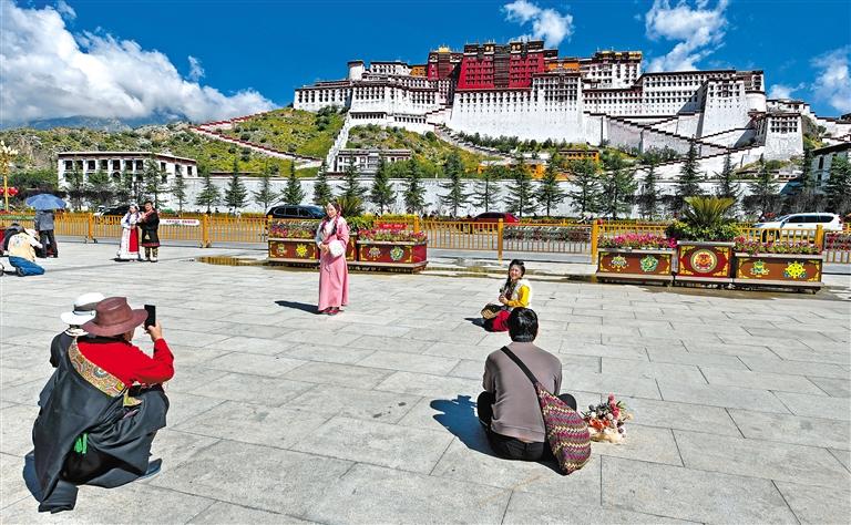 圖為游客在布達(dá)拉宮廣場拍照留影。記者 唐斌 攝
