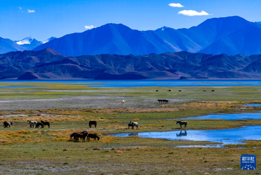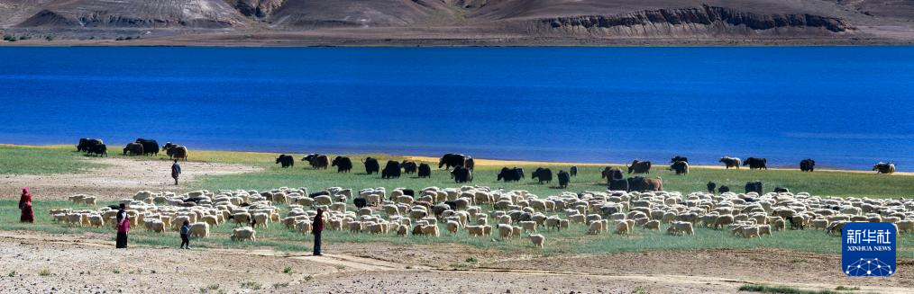 牧民在班公湖畔放牧(無(wú)人機(jī)照片,9月21日攝)。新華社記者 姜帆 攝