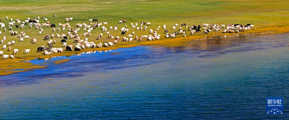 羊群在班公湖畔飲水(無(wú)人機(jī)照片,9月21日攝)。新華社記者 姜帆 攝