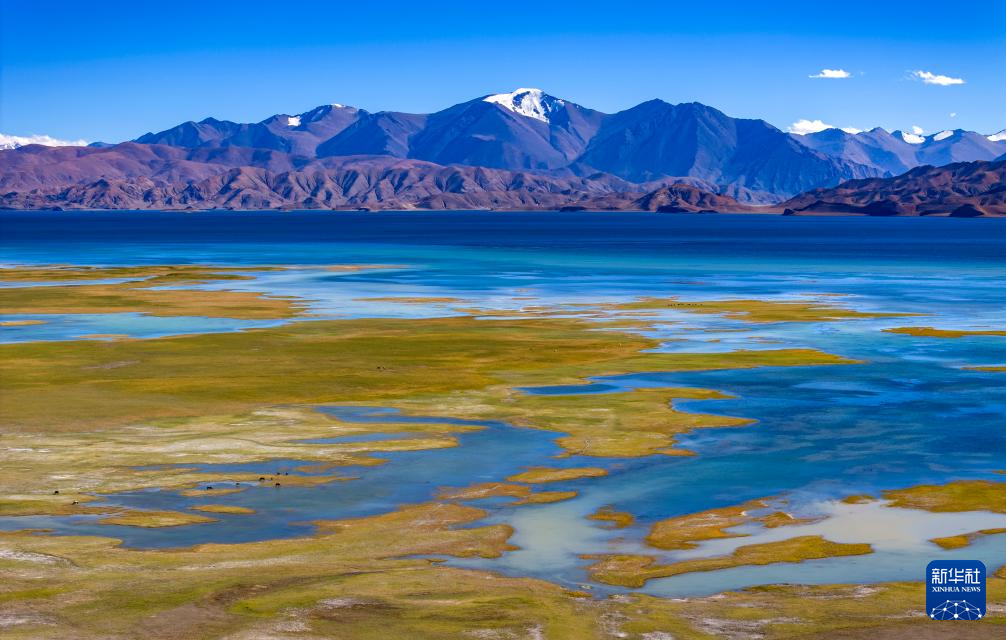 鳥(niǎo)瞰班公湖畔的濕地(無(wú)人機(jī)照片,9月21日攝)。新華社記者 姜帆 攝