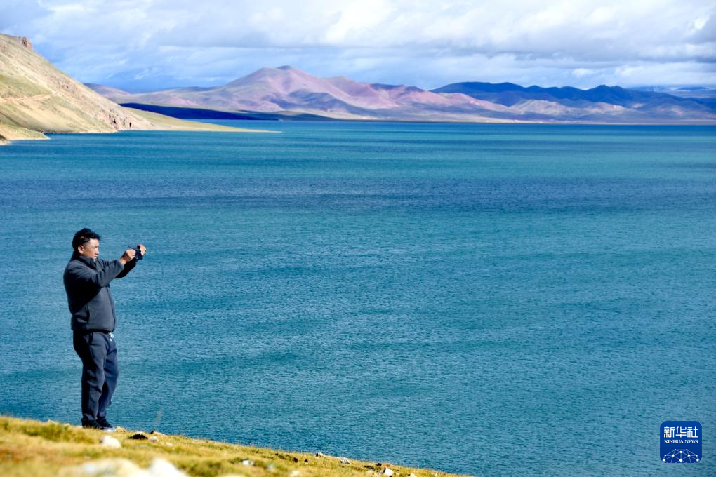 一名游客在錯(cuò)那湖畔拍照留念(9月22日攝)。新華社記者 劉文博 攝
