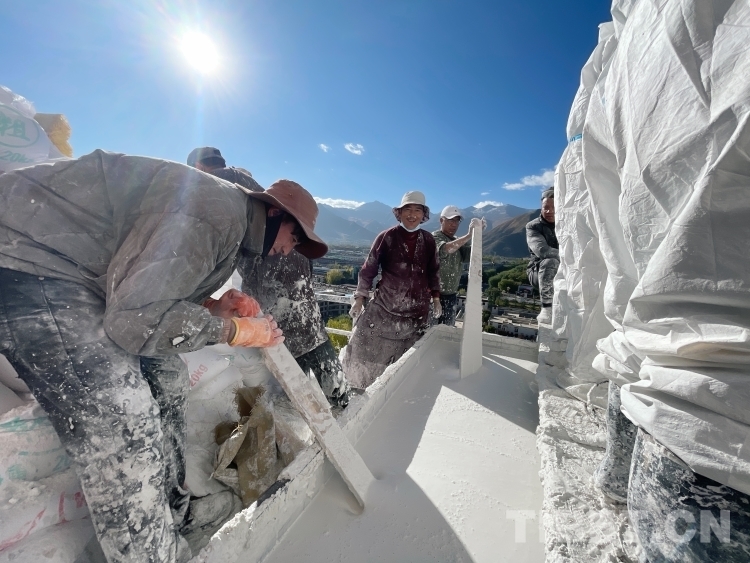 從10月18開始,很多信教群眾和工作人員穿著大褂,或背著裝了白色液體的大桶小桶、或抱著裝了白糖蜂蜜等大袋小袋,紛紛走向布宮的每個(gè)角落,加入到粉刷布達(dá)拉宮外墻的工作中。