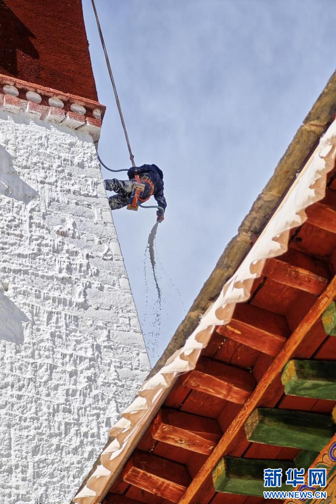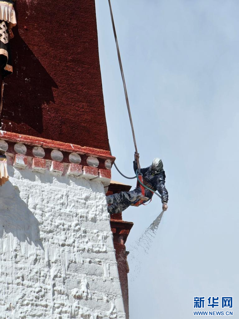 10月18日,布達拉宮“美容師”們在噴灑外墻。新華網(wǎng) 旦增努布 攝 ??