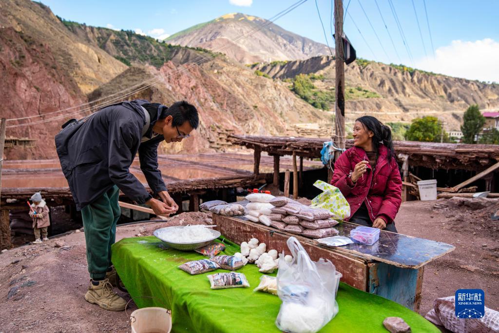 一名村民在西藏昌都市芒康縣納西民族鄉(xiāng)的鹽田旁向游客推銷自家產(chǎn)的鹽(10月20日攝)。新華社記者 孫非 攝
