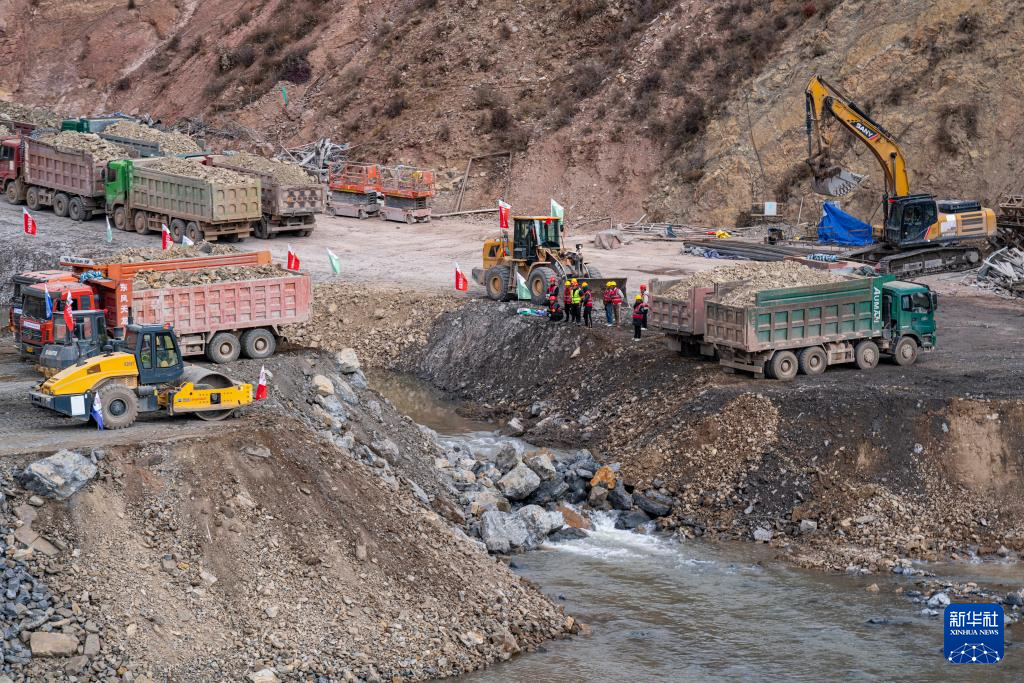 10月31日,施工人員在進行河道截流。新華社記者 孫非 攝