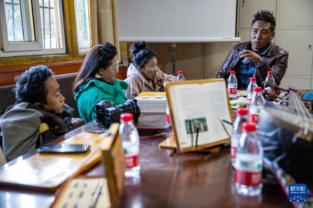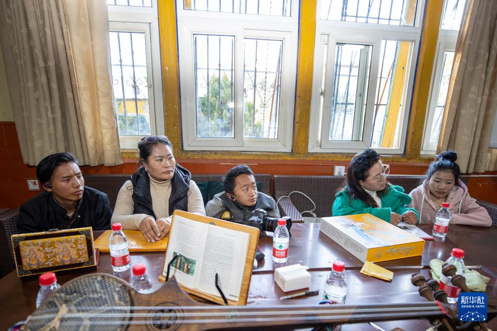 西藏拓崗文化傳播有限公司負(fù)責(zé)人覺列(右一)在直播前與直播團隊討論直播方案(11月10日攝)。新華社記者 姜帆 攝 ??