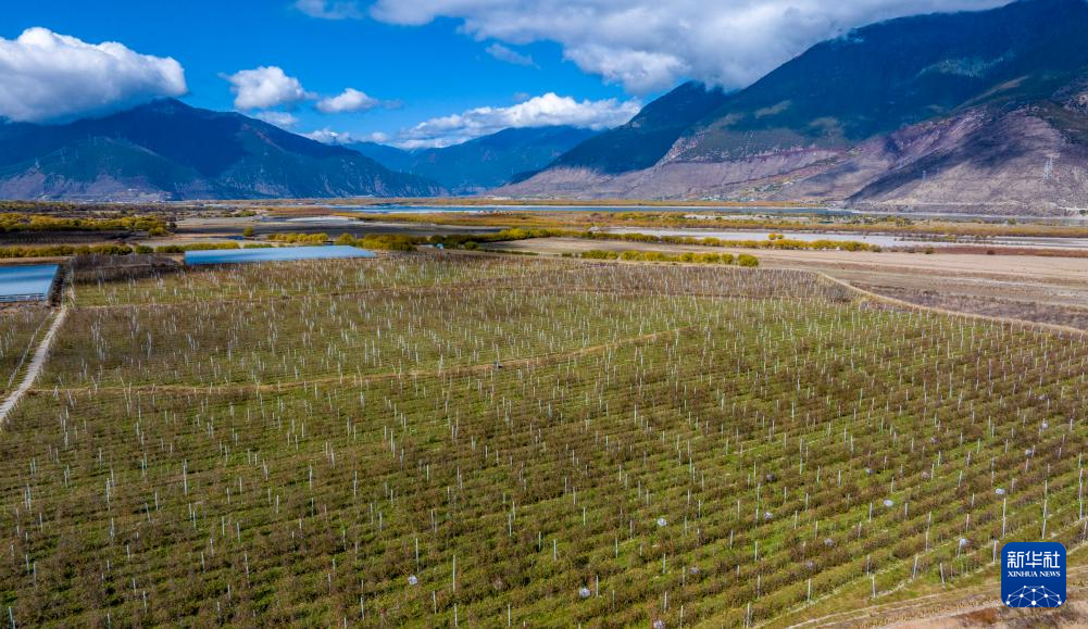 鳥瞰米林市羌納鄉(xiāng)西藏林芝現(xiàn)代蘋果標(biāo)準(zhǔn)化園區(qū)(無(wú)人機(jī)照片,11月13日攝)。新華社記者 姜帆 攝