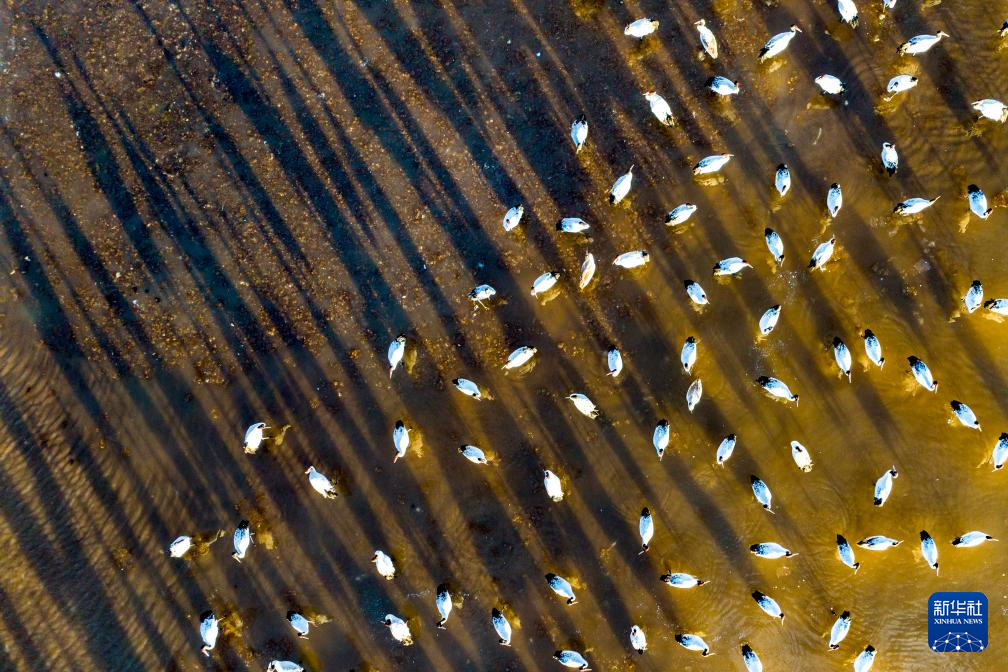 這是12月5日清晨在拉薩市林周縣虎頭山水庫拍攝的越冬黑頸鶴(無人機(jī)照片)。新華社記者 姜帆 攝