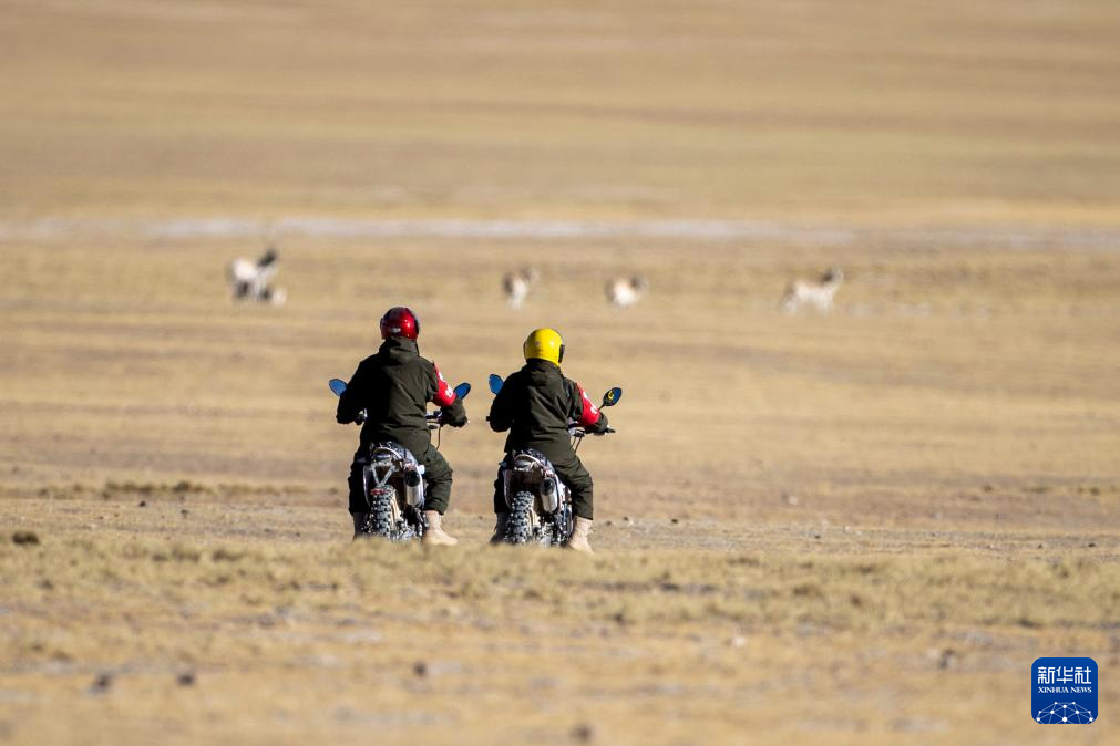 在羌塘國(guó)家級(jí)自然保護(hù)區(qū),野生動(dòng)物管護(hù)隊(duì)員騎著摩托車(chē)觀(guān)察藏羚羊(12月17日攝)。新華社記者 姜帆 攝