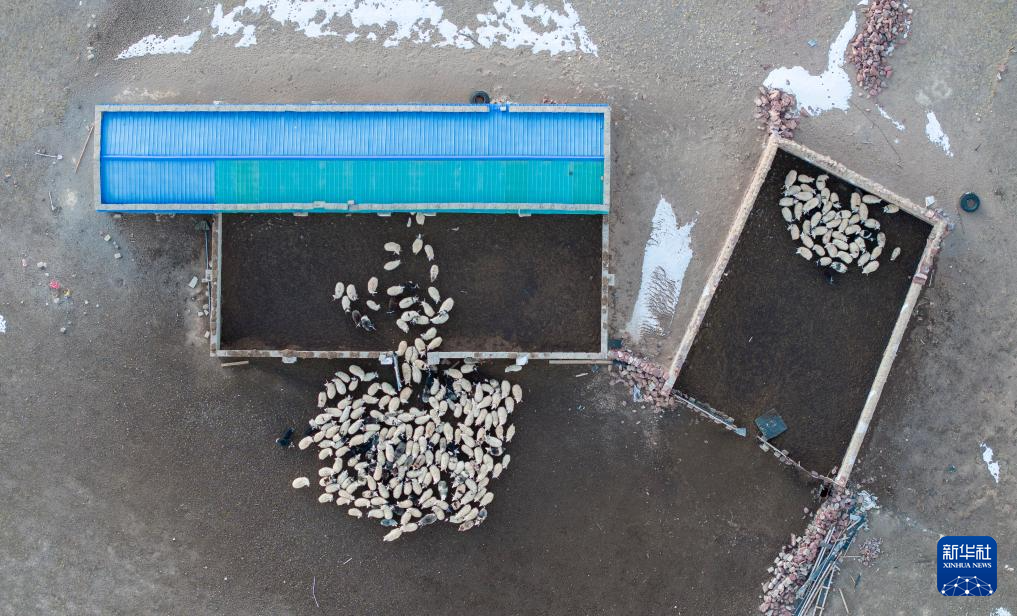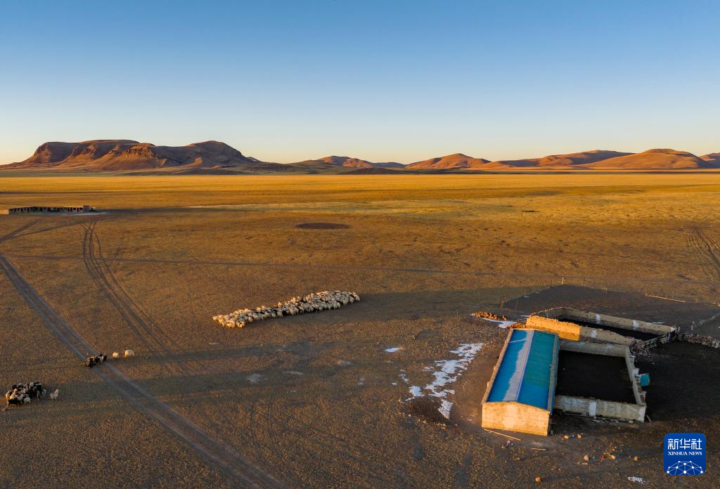 太陽(yáng)落山,丹增家的羊回到棚圈。其中左側(cè)藍(lán)頂?shù)氖侨ツ晷律w的封閉式棚圈,右側(cè)是傳統(tǒng)的敞開(kāi)式羊圈(無(wú)人機(jī)照片,12月18日攝)。新華社記者 姜帆 攝