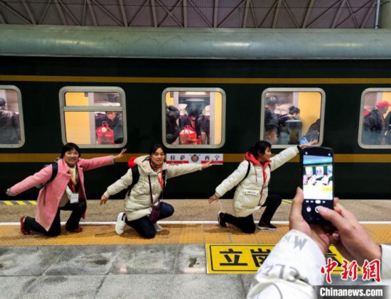 2023年3月1日,乘坐首趟進(jìn)藏旅游專列的旅客與列車合影。楊紅健 攝