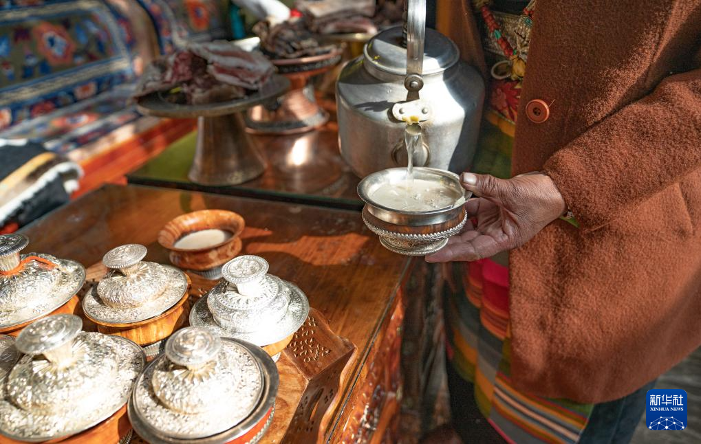 1月12日,巴桑普尺在倒青稞酒。新華社發(fā)(丁增尼達 攝)