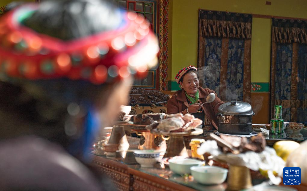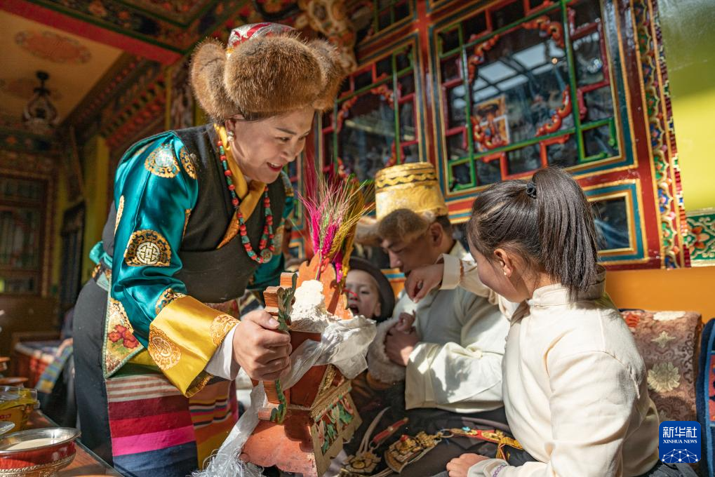 1月12日,巴桑普尺的女兒次仁普尺(左一)為家人獻上寓意五谷豐登的“切瑪”。新華社發(fā)(丁增尼達 攝) ??