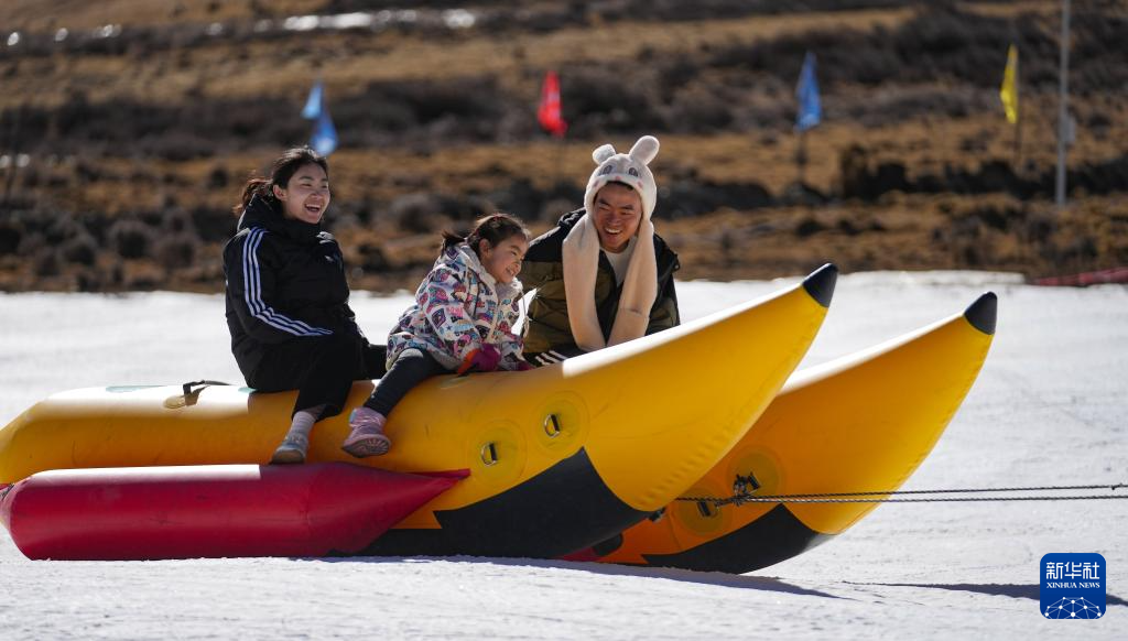 1月13日,游客在墨多滑雪場(chǎng)體驗(yàn)香蕉船嬉雪項(xiàng)目。新華社記者 晉美多吉 攝 ??