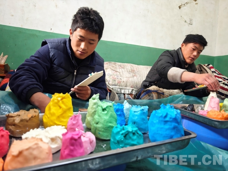 圖為頓珠的兩個(gè)兒子正在捏制酥油花