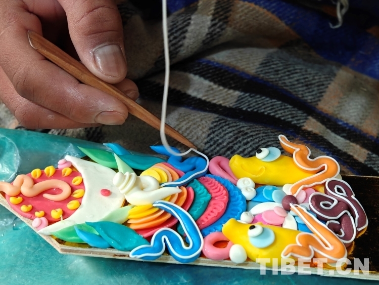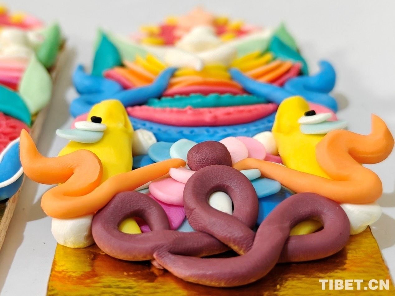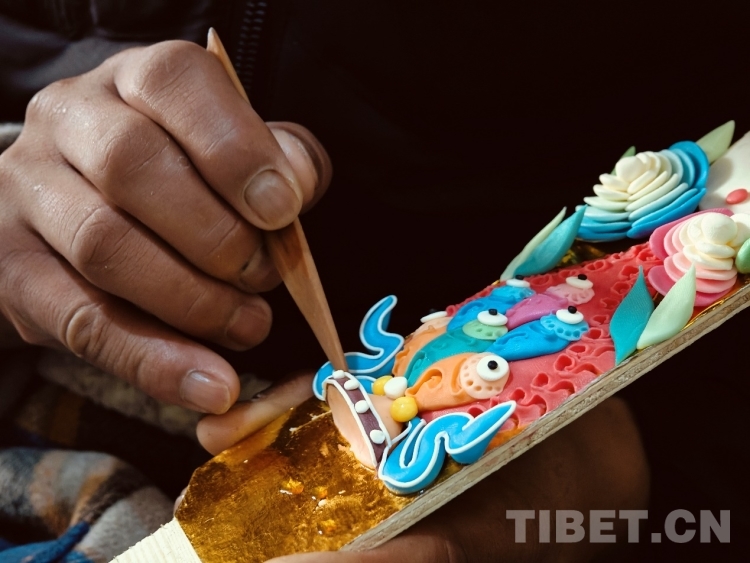 頓珠的二兒子丹增朗杰今年只有19歲,是一名高中生,但制作酥油花的手法已經(jīng)極為嫻熟。他盤腿而坐,面前擺放著調(diào)制好的各色酥油和一盆清水。只見他捏取一小塊酥油在冷水中浸泡一會(huì),然后熟練地用食指和拇指將酥油捏成不同形狀,粘貼于一塊盾形木板上,一對對色彩斑斕、寓意吉祥的酥油花作品便完成了。