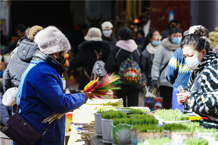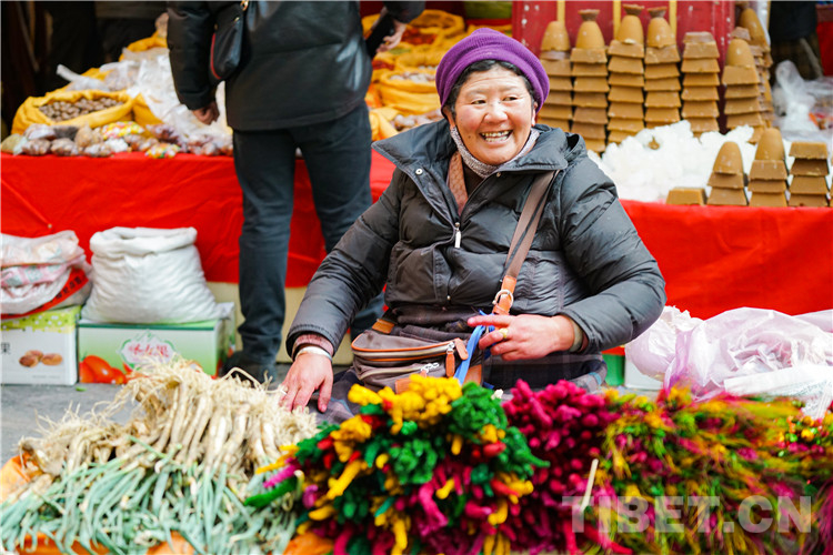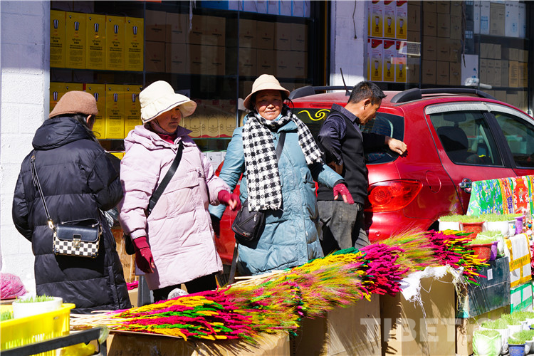 圖為正在銷(xiāo)售青稞苗和“洛薩美朵”的藏族阿佳 攝影:趙振宇