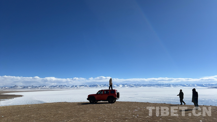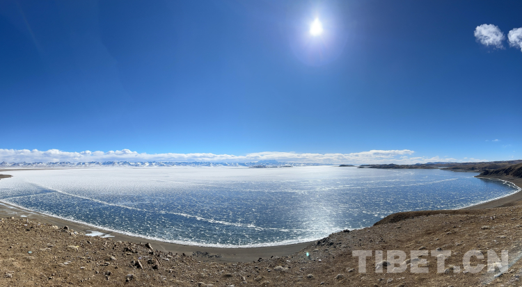 爬上一座山丘,視野陡然明亮開闊起來。原本土黃色的藏北天然牧場高低起伏,黑牦牛零星地散落在山坡,登上高處后,天際圣境納木錯便映入眼簾。初春時節(jié)的拉薩依然春寒料峭,納木錯的落雪還未完全消融,站在高處俯視,這片安靜的大湖被陽光反射得白茫茫一片。更幸運(yùn)的是碰到了晴好的天氣,白云與湖冰相襯,亦與遠(yuǎn)山相接,視線盡頭的念青唐古拉山脈直視無礙,畫面猶如“半池白云半池玉”般頗具美感。