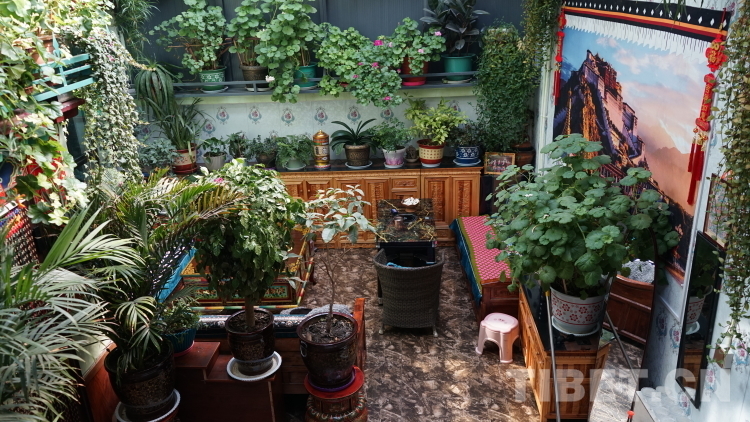德瓊家庭旅館以女主人次仁德瓊的名字命名。工作人員告訴我們,這里是拉康鎮(zhèn)生意最好的旅館之一。旅館位于兩條主干道交接的拐角,地理位置好,招牌也立得醒目,每個進(jìn)入鎮(zhèn)子的人第一眼就能看到德瓊家庭旅館的招牌。但生意好絕不僅僅是因?yàn)榈乩砦恢脙?yōu)越。走進(jìn)這間旅館,如同進(jìn)入一間溫室花棚。在這里,花草植物是絕對的主角,各色草本、藤本、灌木植物高低錯落,幾乎填滿了墻壁空間。蕭瑟的冬日里,粉的、白的、紅的花朵擠擠挨挨地開著,茉莉、山茶、三角梅...來自不同地域的花卉植物在這邊境小鎮(zhèn)的一隅競相綻放,天南海北在此握手言和。德瓊阿佳用她對生活的熱情將家庭旅館裝點(diǎn)得生機(jī)盎然,我想正是這份純真的熱愛才是德瓊家庭旅館生意火爆的關(guān)鍵所在。