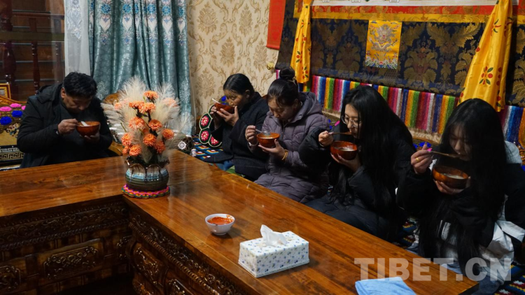 下午時分,“古突”夜的準(zhǔn)備就開始了,先是將羊肉放入鍋中燉煮,再是將白蘿卜切片備好,隨后與奶奶、兩個女兒及丈夫,一家人圍坐在溫暖的廚房說說笑笑地捏“古突”里的面疙瘩,做面疙瘩時,要準(zhǔn)備一些稍大的特殊面疙瘩,分別包進(jìn)寫有石子、辣椒、羊毛、木炭等字樣的紙條,代表“心腸硬”“刀子嘴”“心腸軟”“黑心腸”等含義,待到吃“古突”環(huán)節(jié),來一場藏式風(fēng)格的“開盲盒”,據(jù)說每個人吃到的字樣能在某種程度上代表新一年的運(yùn)勢或性格。