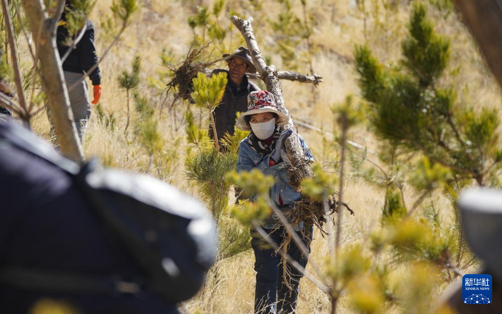 3月12日,東嘎社區(qū)二組村民在搬運樹苗。新華社記者 晉美多吉攝 ??