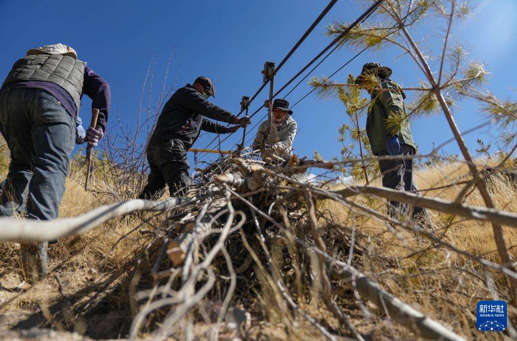 3月12日,東嘎社區(qū)二組村民在通過索道運輸樹苗。新華社記者 晉美多吉 攝 ??