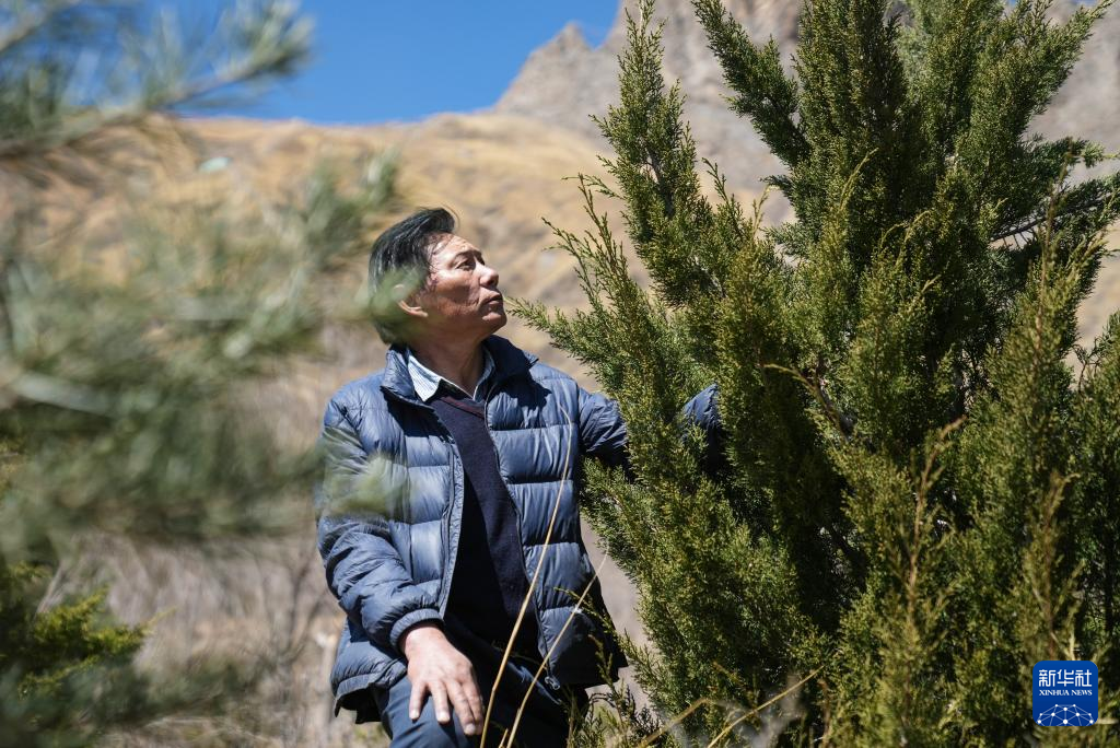 3月12日,東嘎社區(qū)二組組長仁增在查看樹苗長勢。新華社記者 晉美多吉攝 ??