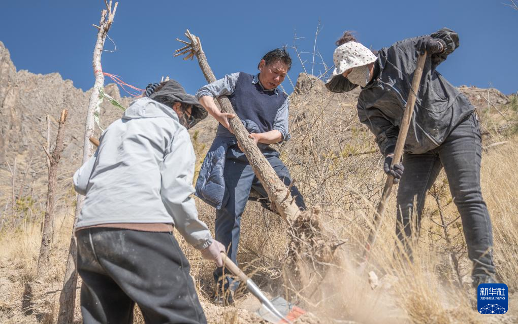 3月12日,仁增(中)和東嘎社區(qū)二組村民在植樹。新華社記者 丁增尼達(dá) 攝 ??