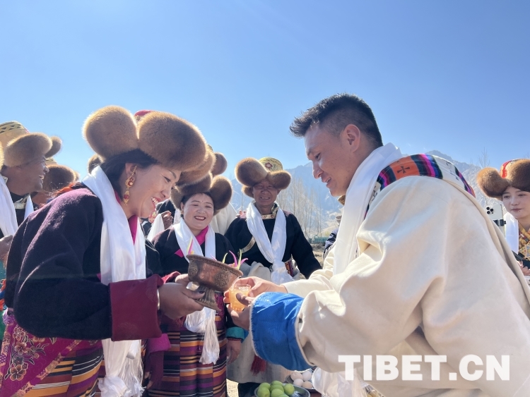 開耕儀式結(jié)束后,茶巴朗村藏戲隊(duì)成員們?yōu)樵缫褤Q好藏裝過來體驗(yàn)西藏民俗文化的游客們獻(xiàn)哈達(dá)、敬青稞酒、唱敬酒歌,游客們現(xiàn)場學(xué)起“三口一杯”與當(dāng)?shù)厝斯捕冗@美好的一天。西藏卓美旅行社負(fù)責(zé)人孫赫男介紹說:“西藏除了山水美景之外,春耕儀式也是非常具有當(dāng)?shù)靥厣奈幕?hào),能給人留下深刻記憶。今天,我?guī)е鴣碜员鄙蠌V等全國各地的游客來這里體驗(yàn)春耕儀式,讓大家看看西藏當(dāng)?shù)氐娜罕娛窃鯓娱_始春天的。游客們穿著藏裝,免費(fèi)品嘗青稞酒、酥油茶、牛肉、藏雞蛋等各種農(nóng)產(chǎn)品,還和充滿熱情的當(dāng)?shù)卮迕駛兓?dòng),他們玩得非常開心。”