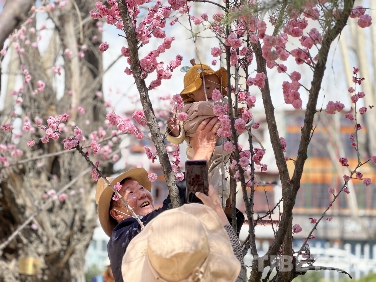 圖為3月19日,拉薩市民在布達(dá)拉宮腳下的宗角祿康公園里賞花并拍照留念 攝影:德吉卓瑪
