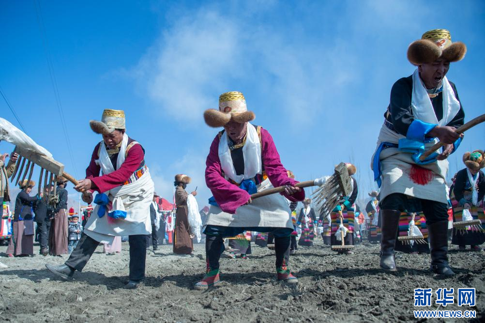3月16日,克松社區(qū)居民格桑多吉(中)在參加春耕儀式。新華網(wǎng) 旦增努布 攝 ??