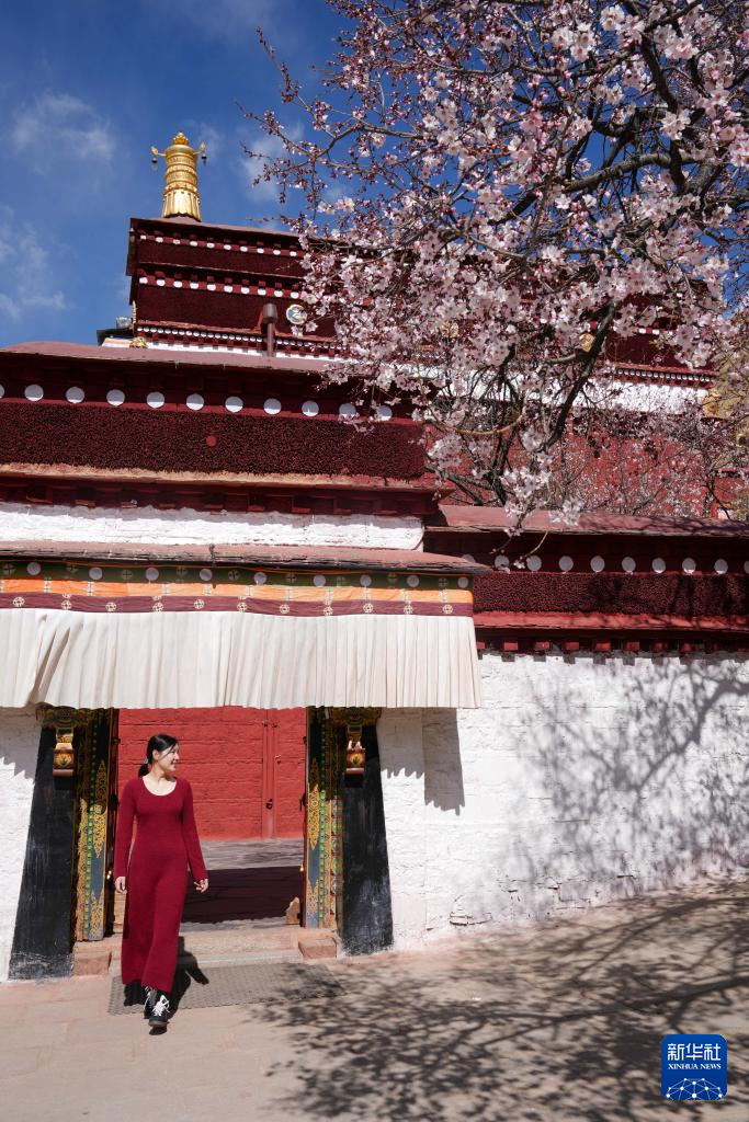 拉薩古剎帕崩崗周圍的桃花盛開(kāi),游客駐足留影(4月5日攝)。新華社記者 旦增尼瑪曲珠 攝