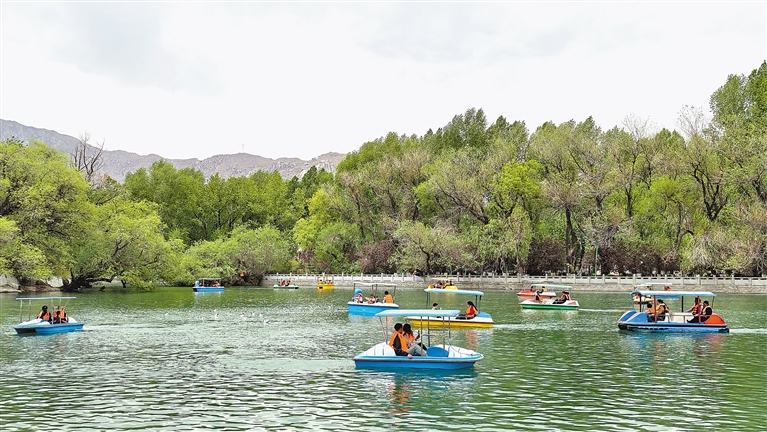 “五一”假期,市民、游客在拉薩宗角祿康公園內(nèi)劃船游玩。記者 唐斌 攝
