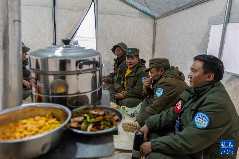 ??野生動物專業(yè)管護隊員們在宿營的帳篷中準備吃飯(5月7日攝)。新華社記者 姜帆 攝