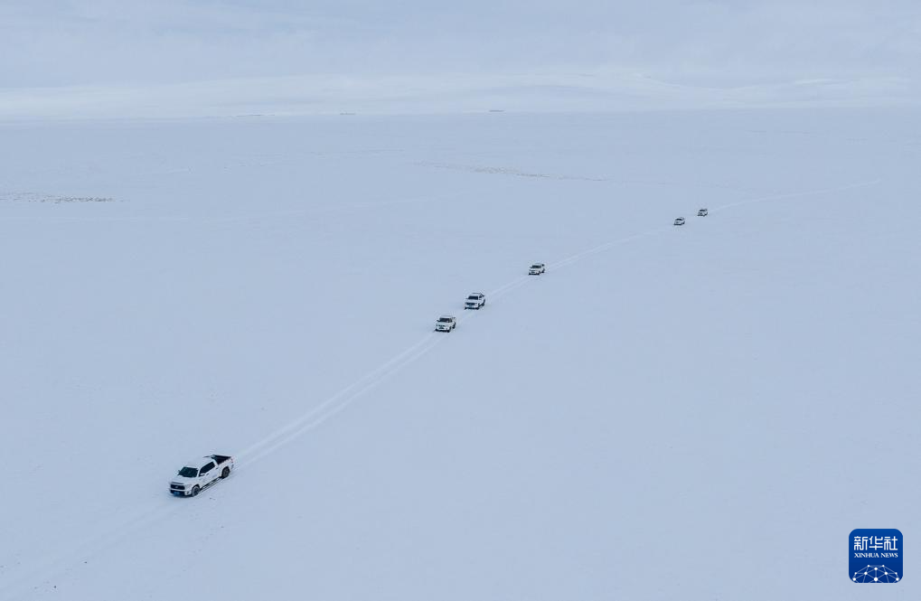 ??野生動物專業(yè)管護隊員的車隊在大雪中巡護(無人機照片,5月8日攝)。新華社記者 丁增尼達 攝