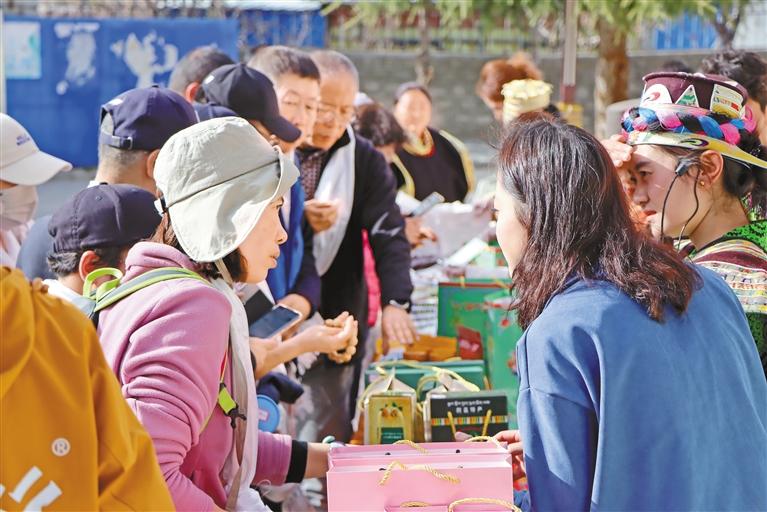 游客在選購?fù)撂禺a(chǎn)。謝筱純 攝