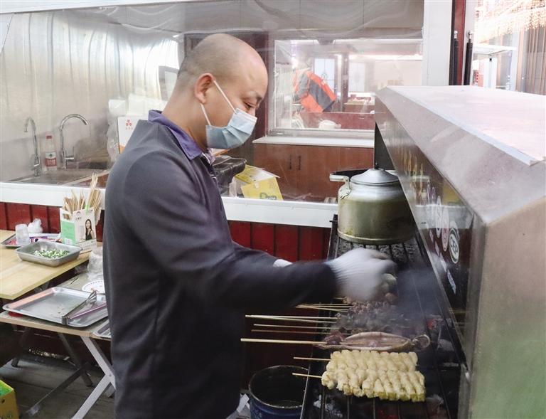 炒粉伴著滋啦作響的油爆聲在鍋中“跳躍”,燒烤師傅撒下的孜然和辣椒裹滿肉?!坏赖烂朗吃诔载泜兤谂蔚哪抗庵猩献?,來一杯冰鎮(zhèn)汽水或冰啤酒,盛宴就此開始……