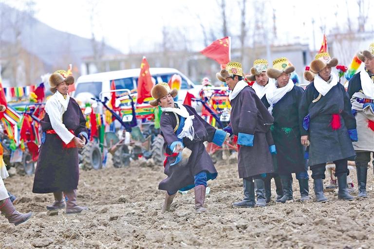 墨竹工卡縣甲瑪鄉(xiāng)龍達(dá)村村民在春耕儀式上開展打牛角活動(dòng)。