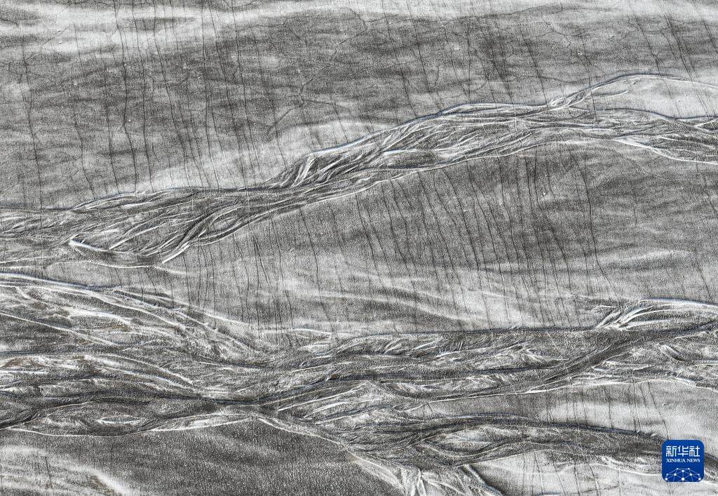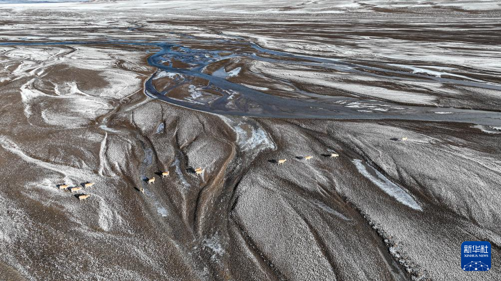 藏羚羊排隊走過甜水河河床,留下整齊的印跡(6月15日攝,無人機(jī)照片)。新華社記者 晉美多吉 攝