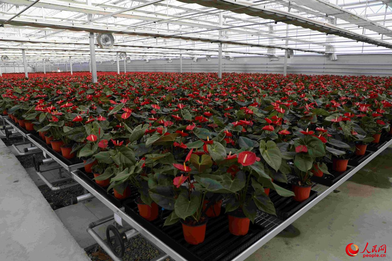 圖為智能連棟玻璃溫室內(nèi)盛開的紅掌。人民網(wǎng)記者次仁羅布 攝