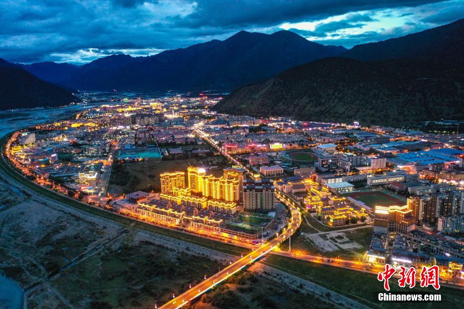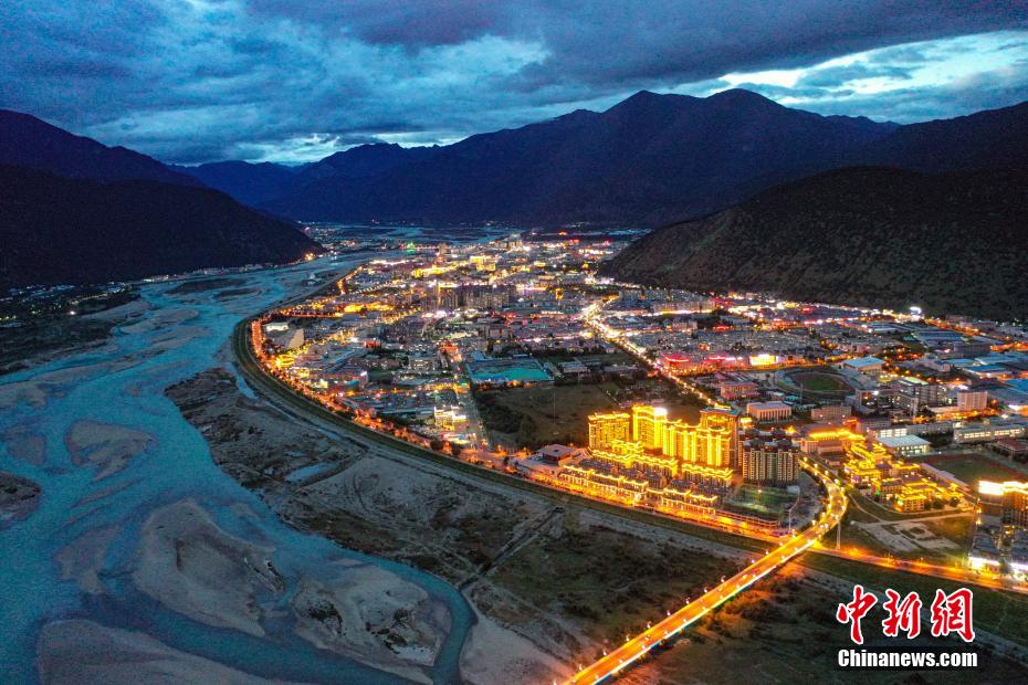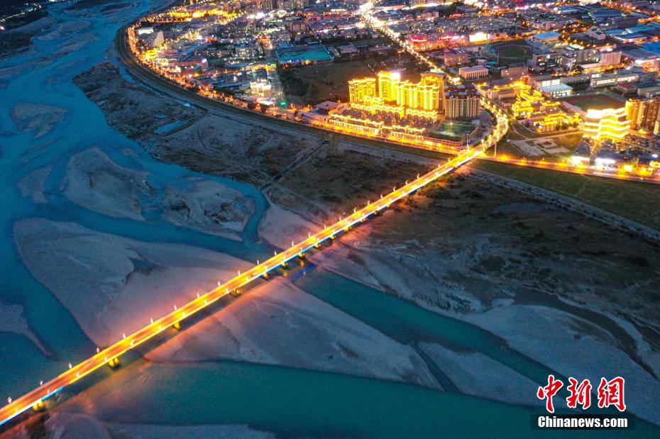 8月22日晚,西藏林芝市城市夜景美,城市建筑、橋體的燈光與尼洋河相映成趣,景色美麗。(無人機(jī)照片)中新社記者 貢嘎來松 攝