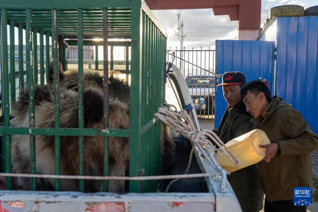 野保隊(duì)員在西藏那曲市尼瑪縣羅布玉杰野生動(dòng)物管護(hù)站為放歸棕熊做準(zhǔn)備(8月30日攝)。新華社記者 姜帆 攝