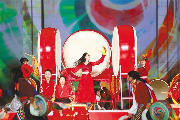 共振共鳴中國鼓,交流交融民族情。在激昂的鼓聲和大開大合的舞姿中,開幕式序曲《大江之鼓》緩緩呈現(xiàn)在所有人面前。喆友打擊樂團、山南市瓊結(jié)久河卓舞隊等隊伍的近70名鼓手同臺獻藝、默契配合,讓鼓聲共振、情感共鳴,展現(xiàn)了激情洋溢、魅力無限的中華鼓文化。