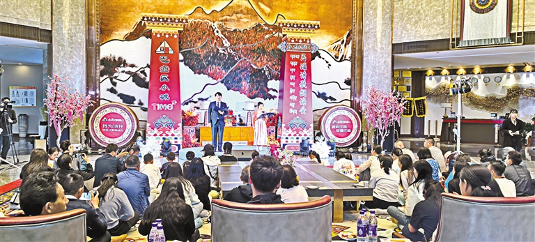 圖為林卡主題音樂(lè)會(huì)上,工作人員為市民、游客介紹農(nóng)特產(chǎn)品。