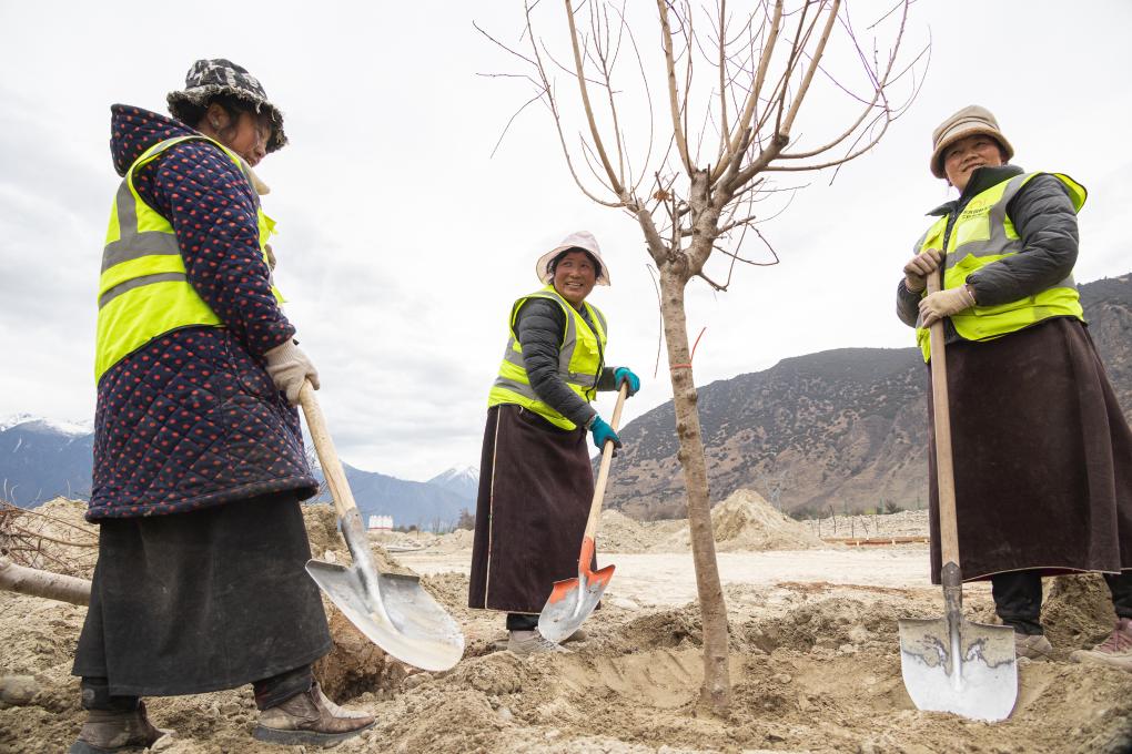 3月30日,西藏林芝市巴宜區(qū)林芝鎮(zhèn)嘎拉村村民尼瑪曲吉(中)與姐妹們一起在尼洋河灘上種樹。新華社記者丁增尼達(dá) 攝