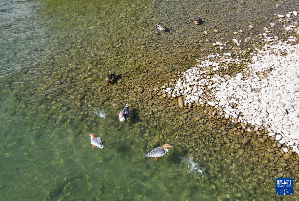 在林芝雅尼國家濕地公園內(nèi),不同種類的野生鳥類棲息在尼洋河畔(10月24日攝,無人機(jī)照片)。新華社記者 劉天宇 攝??