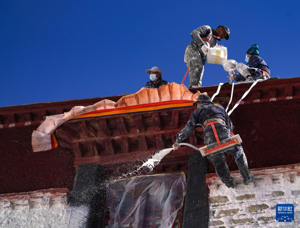10月30日,布達拉宮管理處的工作人員在噴灑涂料。新華社記者 晉美多吉 攝 ??