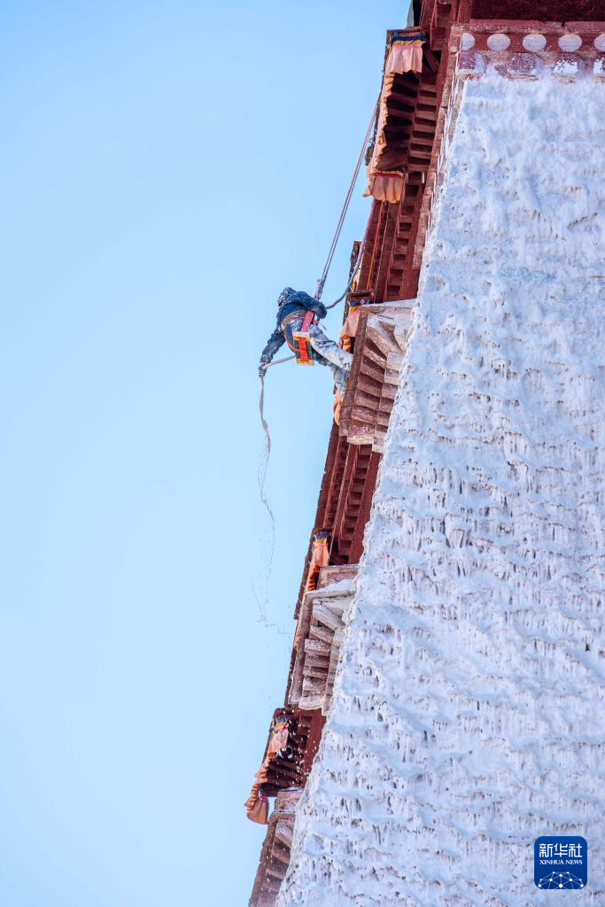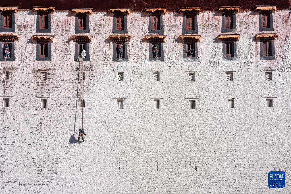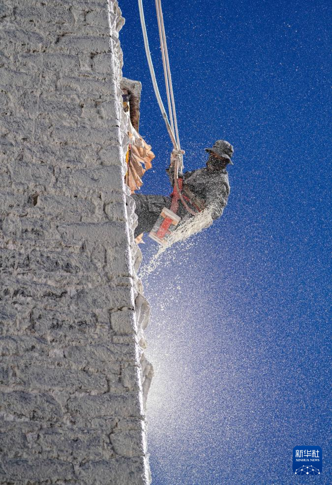 10月30日,布達拉宮管理處的工作人員在噴灑涂料。新華社記者 旦增尼瑪曲珠 攝 ??