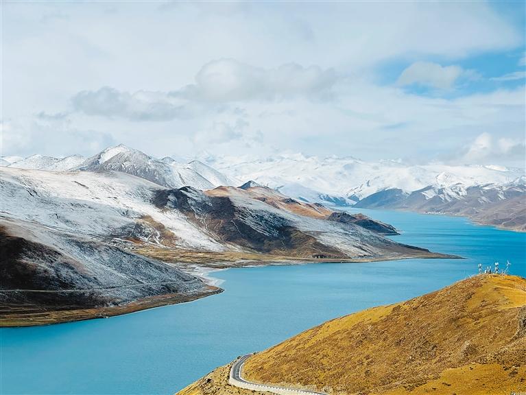 羊卓雍錯(cuò)簡(jiǎn)稱羊湖,位于山南市浪卡子縣境內(nèi),湖面海拔4400多米。初冬時(shí)節(jié),羊卓雍錯(cuò)湛藍(lán)的湖水波光粼粼,湖畔的雪山分外嬌嬈,呈現(xiàn)另一番壯美景觀。 圖為鳥(niǎo)瞰羊卓雍錯(cuò)。記者 卓瑪七林 攝