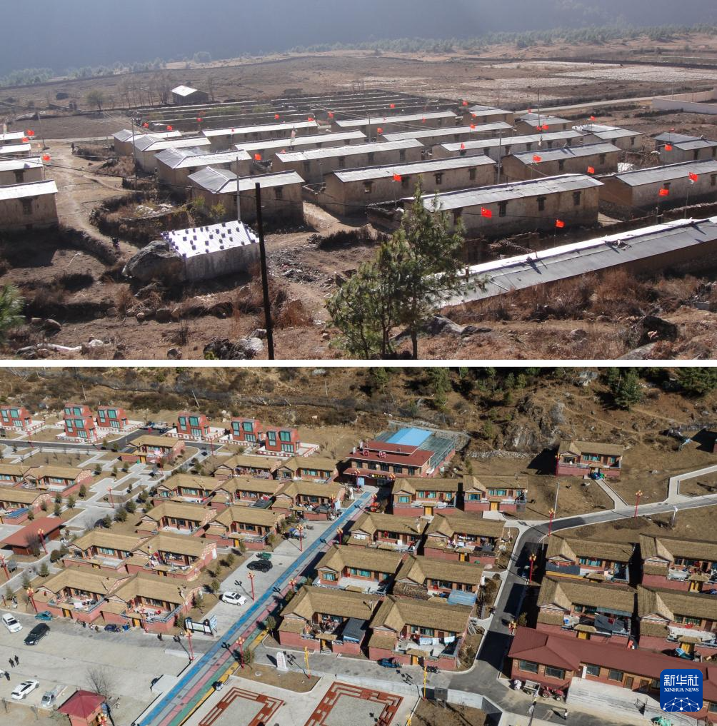 拼版照片,上圖為:2005年拍攝的達曼新村(新華社發(fā));下圖為:2024年12月15日拍攝的達曼新村(無人機照片,新華社記者丁增尼達攝)。新華社發(fā) ??